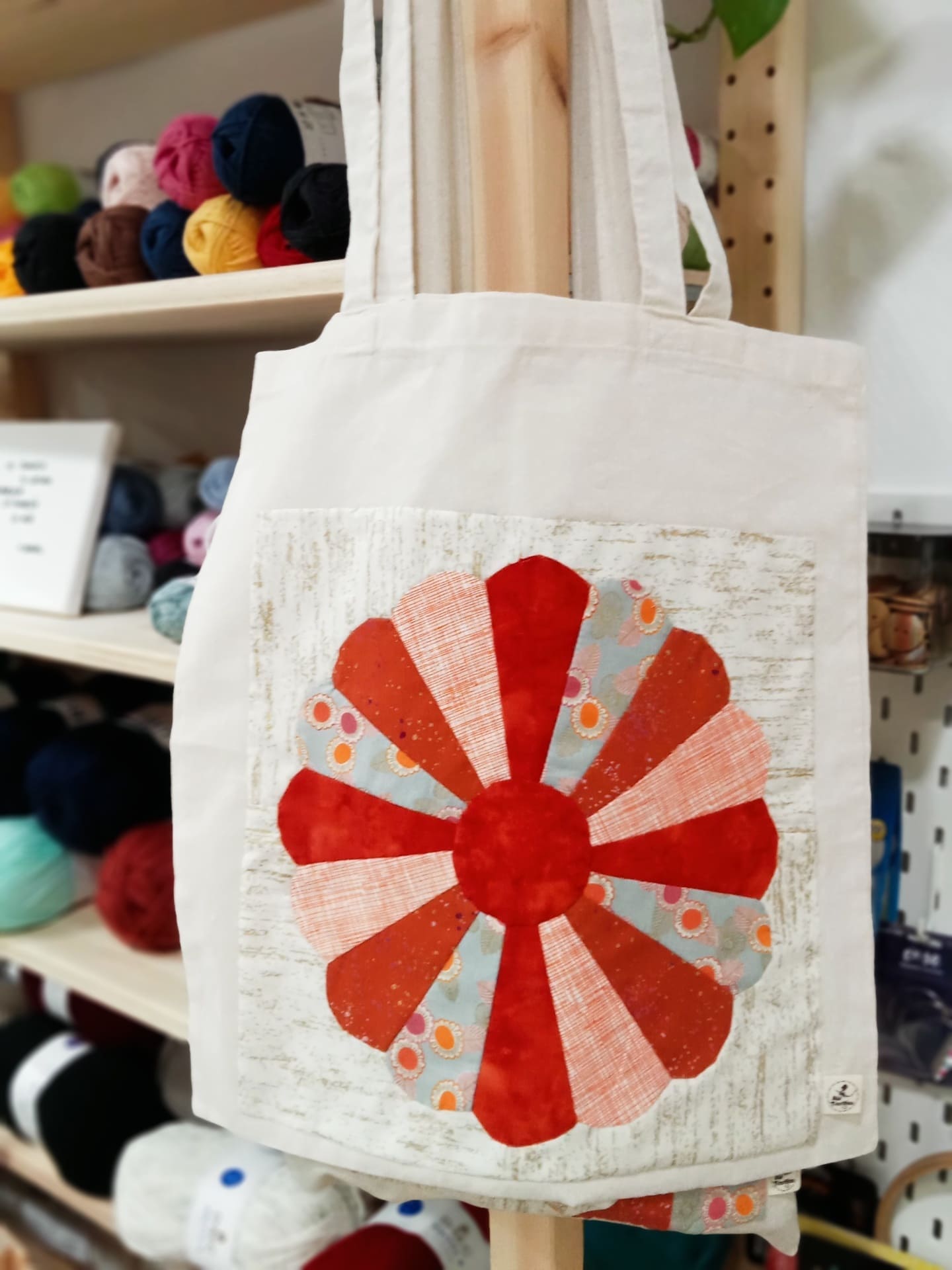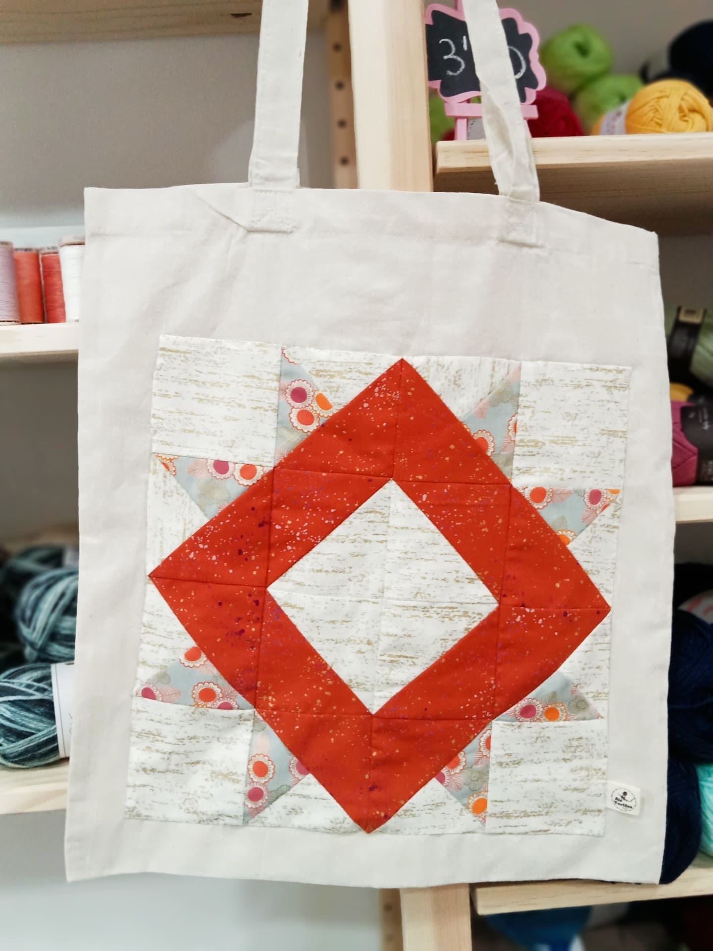 Nuestras tote bags con bloques patchwork están confeccionadas a mano con telas de algodón combinadas en colores y texturas distintas, lo que convierte a cada pieza en un diseño exclusivo.